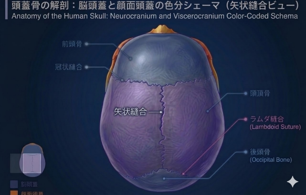 - ラムダ縫合: 左右の頭頂骨と後頭骨の間。
