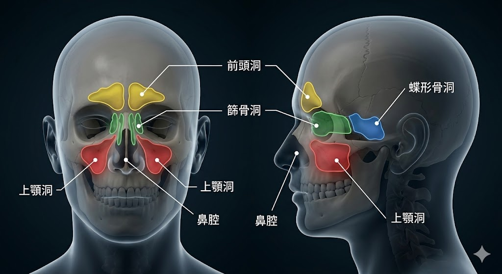 - 副鼻腔は、それが位置する骨の名称に従い、以下の4つの名称で分類される。