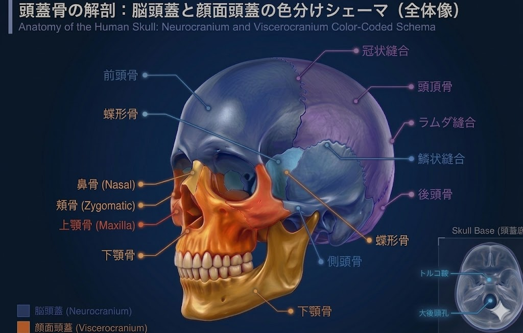 - 脳頭蓋(脳を保護する骨): 前頭骨、頭頂骨(2)、側頭骨(2)、後頭骨、蝶形骨、篩骨。