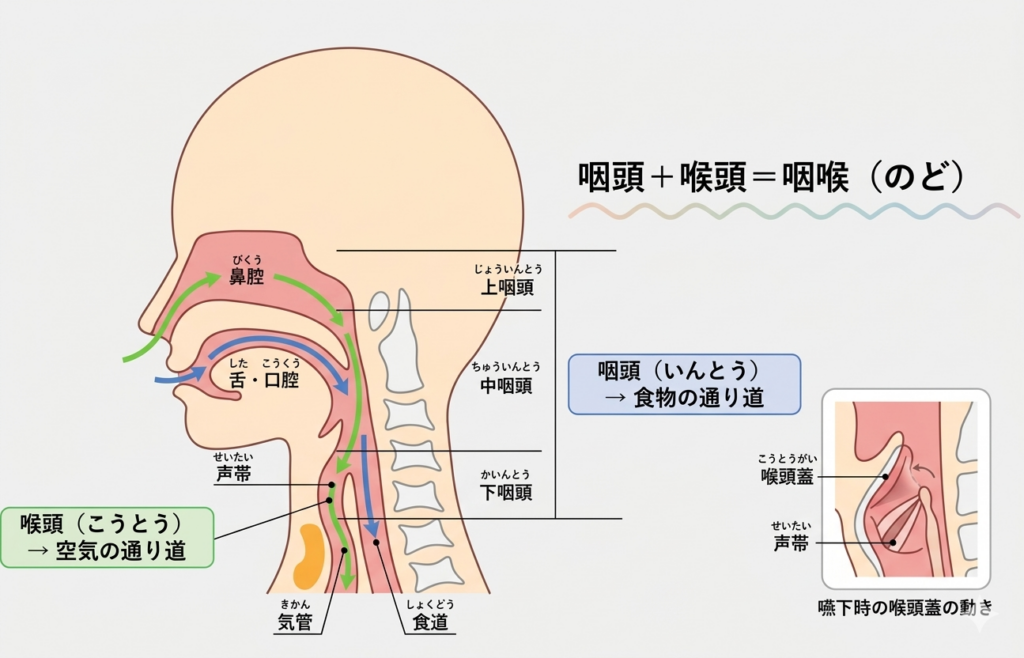 - 喉頭蓋(こうとうがい): 嚥下時に、食物が気道(喉頭)へ進入しないよう蓋をする役割を担う。
